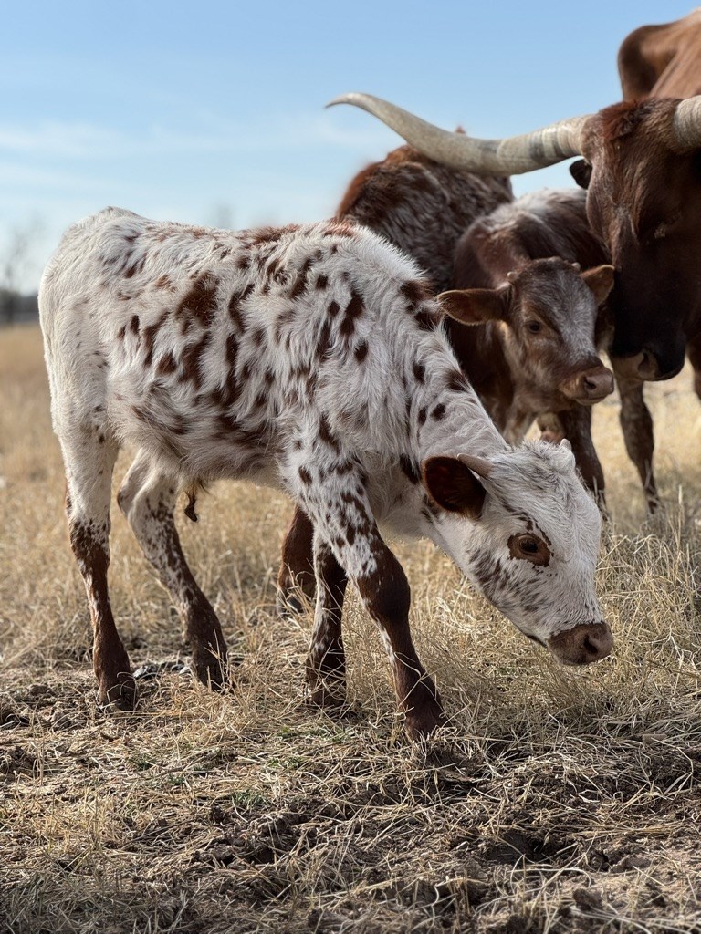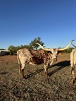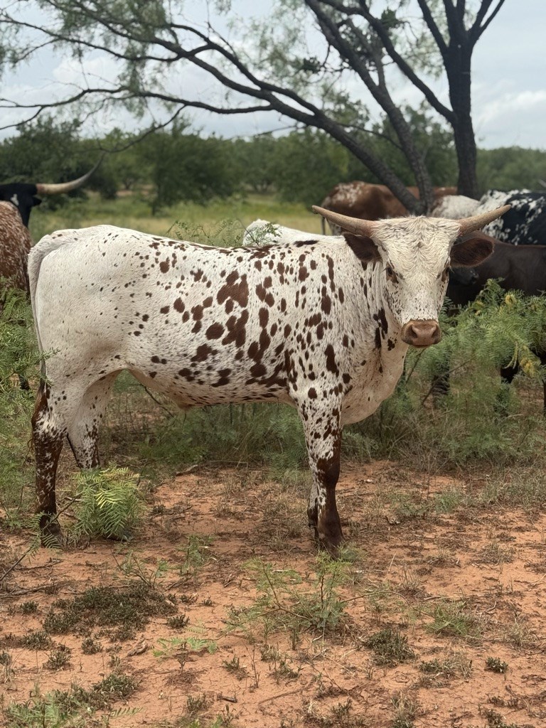 Great trophy steer prospect here. Very pretty spotted color pattern and we expect him to have the horn to go along with it. His sire is over 90" with his damn having a great high handlebar set of horns.
