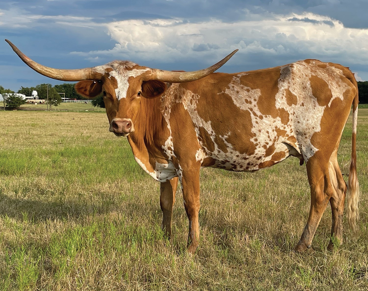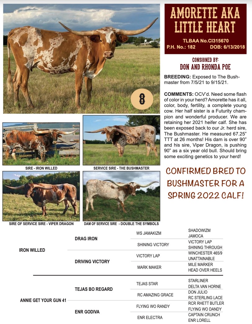 Amorette has been a joy to have on the ranch. She is a colorful, clean, and easy going female. She raised her first calf with ease. She is being offered for sale in the 2021 Horn Showcase Select Sale. Confirmed bred to Bushmaster for a 2022 spring calf!